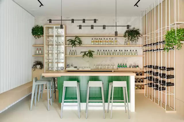 “Pensei em um ambiente com funções diferentes e que coexistem: um espaço de living e descompressão, voltado para o jardim. Ao fundo, um bar super equipado, com banquetas ao redor para encontros e drinques”, pontua Estela.