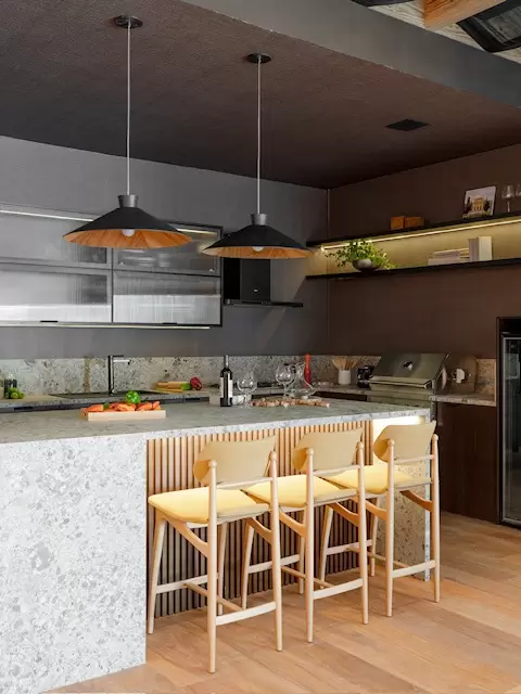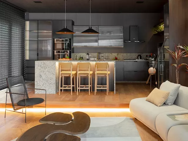 Minimalista, industrial e ao mesmo tempo acolhedor, o espaço combina materiais naturais como madeira, pedra e ferro com acabamentos tecnológicos e iluminação em LED. A cozinha gourmet integrada transforma o ambiente em um verdadeiro palco de celebração, com cooktop, torre quente, coifa circular e adega embutida. O projeto também conta com infraestrutura para carregador elétrico, reforçando o compromisso com a sustentabilidade.