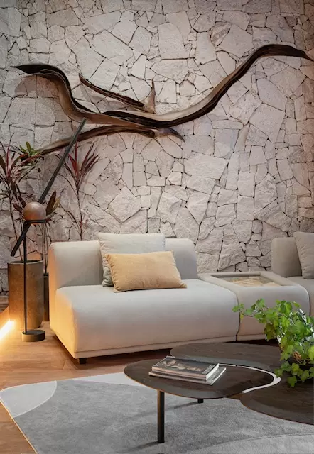 Entre os principais destaques do ambiente Raízes e Rodas, estão a integração entre garagem e cozinha gourmet, a volumetria arquitetônica composta por um módulo térreo com pergolado de madeira sobreposto, que cria a sensação de um segundo nível, e as grades personalizadas em MDF, inspiradas no design da Volvo, que reforçam a identidade visual do projeto. O uso de materiais naturais e sustentáveis como pedra, madeira e ferro, a presença do Volvo XC60 híbrido como elemento conceitual, a iluminação em LED embutida e a ventilação natural trazem conforto e eficiência. Tudo isso é complementado por mobiliário assinado e curadoria de peças de design brasileiro e internacional, que conferem sofisticação e autenticidade ao espaço.