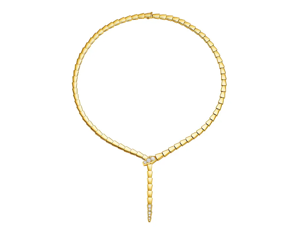 Em ouro amarelo, tom precioso profundamente entrelaçado com o legado da marca, a coleção revela um brilho intenso e um apelo contemporâneo. Um colar com um pingente de serpente em miniatura elegantemente entrelaçado na corrente incorpora as curvas refinadas da criatura, enquanto um colar moderno traduz o movimento flexível e sinuoso do animal em uma linguagem geométrica irresistível e linhas fluidas. O design é finalizado com extremidades cravejadas em pavê de diamantes que amplificam seu brilho em um sutil jogo de luz. Completando o conjunto em ouro amarelo, um par de brincos longos evoca o mesmo movimento rítmico, com suas cabeças e caudas cravejadas de diamantes cintilando a cada movimento.